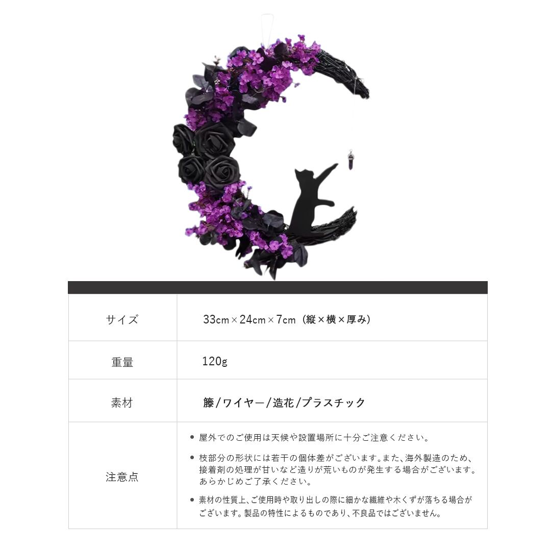 紫の花や黒猫の装飾がゴシックな雰囲気を演出し、玄関・窓・室内の壁などに吊るすだけで一気にハロウィンムードが高まります。