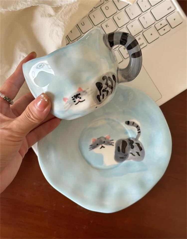 不規則手作り 猫モチーフ釉下彩陶器 コーヒーカップ ブルー&ソーサーセット