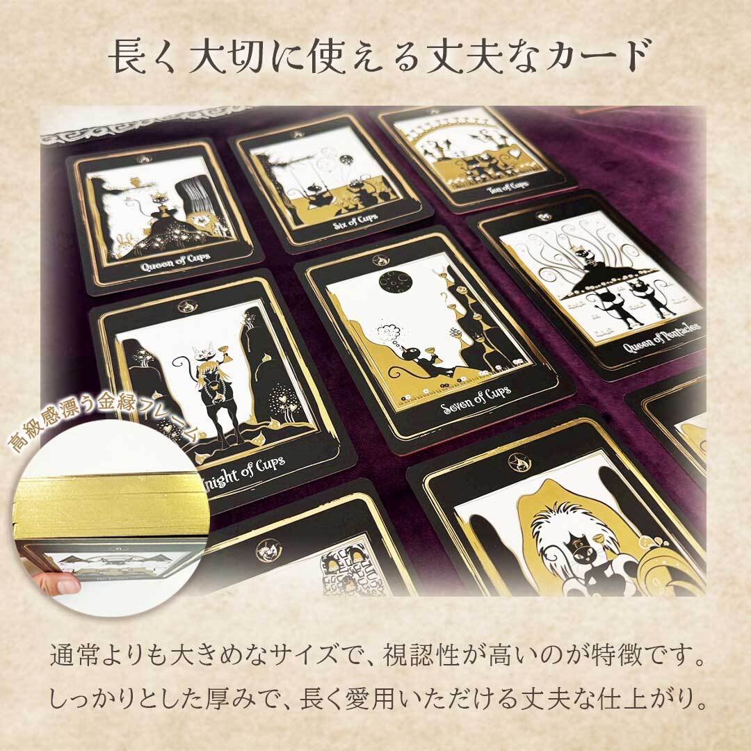 金縁加工されたカードと、モダンで幻想的なアートが猫好きにも占いファンにも大人気のデッキです。