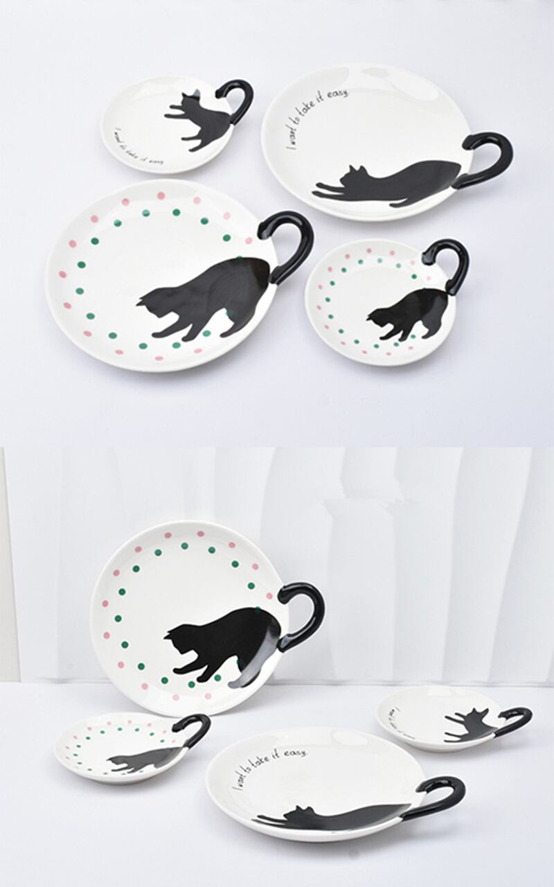 ちょこんと立ち上がった黒猫のしっぽが、そのままお皿の持ち手(ハンドル)になっているユニークなデザイン。