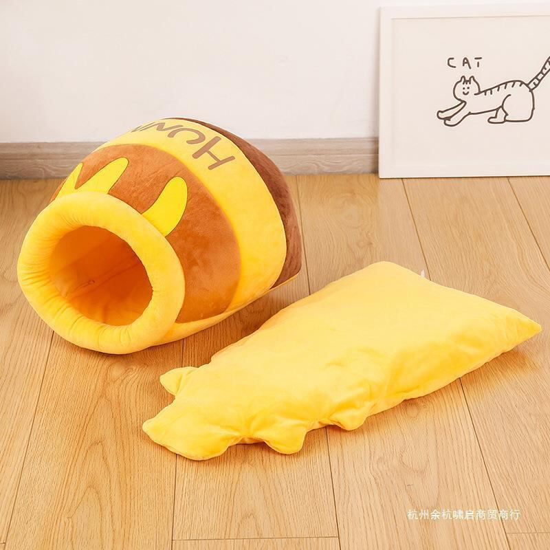 ハチミツがこぼれているように見える部分は、取り外し可能なクッションマットになっており、猫ちゃんが広々と寝ることも、中に隠れることもできます。