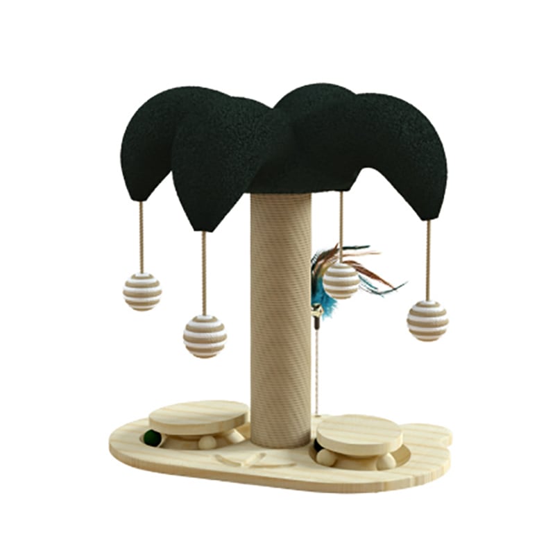 「パームツリー・スクラッチタワー」は、天然木と深緑のモフモフな葉っぱ(キャノピー)が、まるで南国のヤシの木を思わせる、おしゃれでスタイリッシュなキャットタワーです。