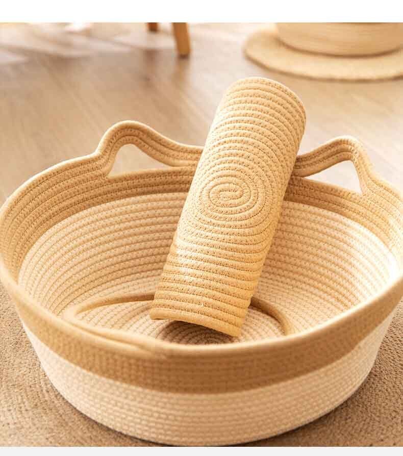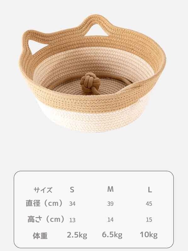 ナチュラルなロープを丁寧に編み上げた、お耳のデザインが可愛らしいキャットベッドです。シンプルな円形デザインは、どんなインテリアにも馴染み、猫ちゃんが自然に丸まってリラックスできる理想的な形を追求しました。